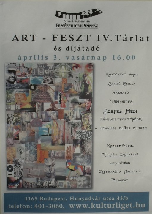 Tisztelettel meghívjuk Önt és barátait 2011.04.03. 16 órára az ART-FESZT IV.kiírt pályázatra bekerült alkotók műveinek tárlatára Corvin Művelődési Ház 1165 Budapest, Hunyadvár u. 43/b
